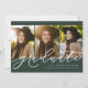 Celebrate your graduate three-photo graduation announcement that features a modern and trendy calligraphy script "graduate" on the front in white against a classic hunter green background. The back of the card features a simple geometric pattern in green and white. The colour can be changed by clicking "customize further."