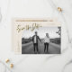 Modern and stylish save the date card featuring a hand lettered script text that says "save the date." One photo in the font and one on the back. The background is cream.