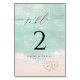 Beautiful turquoise abstract watercolor sparkling ocean wave and hearts in the sand beach background, toped with stylish script and elegant serif font, modern and simple. Great wedding table cards for nautical beach wedding, tropical destination wedding, coastal ocean themed wedding in summer.