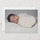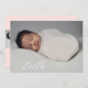 Birth announcement featuring a modern script Hello overlapping the photo. The back allows for three extra photos and a message with an editable background colour.