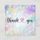 say big thank you and show your love and customer appreciation with this modern script card with the heart and holographic background, inviting them to purchase again, leave a review and tag you on social media. You can change the colours of the heart, text and icons to fit your branding