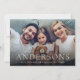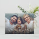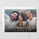 Modern minimalist merry Christmas card design features family name in elegant trendy script and typography, with personalized family photo, simple and unique greeting cards.