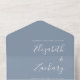 This simple modern all-in-one wedding invitation features white text on a dusty blue background. Add the names of the bride and groom in stylish handwriting calligraphy and the details in sans serif font. The detachable RSVP features dusty blue text on a white background. Add your return address in white on the dusty blue exterior flap and back of the RSVP.