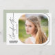 This modern script graduation party invitation features a minimalist design accented with handwriting style text on a white background. The backside offers custom text for you to add your party invitation details on a light sage green background.