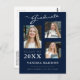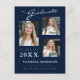 Modern 3 photo graduation announcement postcards. This custom design combines handwritten, calligraphy style script with modern text in white and light grey on a stylish navy blue background. The back of the design offers customizable text fields for your announcement and graduates information. To see more items like this, visit my store here at "www.Zazzle.com/LakeViewCardCo". Thanks