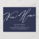 Navy blue new home new address announcement featuring a modern script font with a coordinating plaid back for an extra touch.