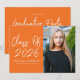Modern graduation party invites featuring "Class of 2023" in a white handwritten script on an orange background. Personalize the front of the graduation invite by adding the graduate's name, school name, and vertical photo. The invite reverses to display your graduation party details in white lettering on an orange background.