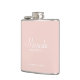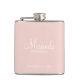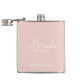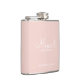 This flask features personalized bridesmaid's name in white modern script font style with title and wedding date in white modern sans serif font style on blush pink background.