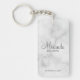 This keychain features personalized bridesmaid's name in grey modern script font style with title and wedding date in grey modern sans serif font style on white marble background.