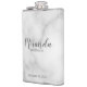 This flask features personalized bridesmaid's name in grey modern script font style with title and wedding date in grey modern sans serif font style on white marble background.