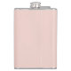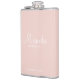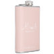 This flask features personalized bridesmaid's name in white modern script font style with title and wedding date in white modern sans serif font style on blush pink background.