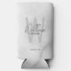 This design features personalized name in grey modern handwriting script font style and monogram in light grey modern sans serif font style as background, with wedding details in grey modern sans serif font style, on white marble background.