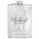 This flask features personalized groomsmen's name in grey modern script font style and monogram in light grey modern script font style as background with title and wedding date in grey modern sans serif font style on white marble background.