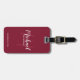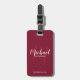 This luggage tag features personalized groomsmen's name in white modern script font style and monogram in light burgundy red modern script font style as background with title and wedding date in white modern sans serif font style on burgundy red background.