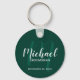 This keychain features personalized groomsmen's name in white modern script font style and monogram in light emerald green modern script font style as background with title and wedding date in white modern sans serif font style on emerald green background.