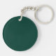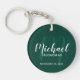 This keychain features personalized groomsmen's name in white modern script font style and monogram in light emerald green modern script font style as background with title and wedding date in white modern sans serif font style on emerald green background.