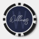 This design features personalized name in white modern handwriting script font style and monogram in light navy blue modern sans serif font style as background, on navy blue background.