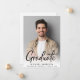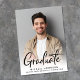 Modern graduation announcement featuring the grad's photo overlayed with "Graduate" in a contemporary bold script. Add their name, class year and school in simple typography.