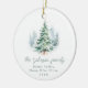 Personalized family Christmas ornament features watercolor pine tree and elegant script family name in sage green, modern and simple.