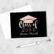 Custom graduation thank you note cards a black background (can be customized) with stylish and trendy rose gold / blush pink and white "Class of 2026" calligraphy script design with grad cap and graduate name in modern script.