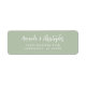 This simple, modern wedding return address label features the couple's names in stylish white script, with two lines for the address below in white sans serif font on a sage green background.