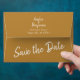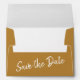 Modern Script Save the Date Return Address Wedding envelope. The text is in modern white script - personalize the envelope with the bride`s and groom`s names and the address. Change or erase the Save the date text. The envelope is in a golden colour, but you can choose any other colour. Great for your wedding, engagement and save the date mailing.