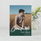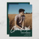 Modern white script "Graduate" overlay, senior class photo graduation announcement and invitation in green. Template lines for graduate's name, class of year and school. Back of card features 2 additional photo spaces with text lines for your open house/graduation party details.