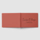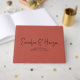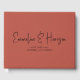 Create a simple unique modern typographic rust orange wedding guest book that includes your first names in a pretty white handwritten script font, contrasted with your wedding date, wedding location city and state. Simple elegance in a modern minimalist style.