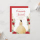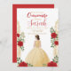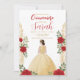 nvite friends and family to a magical celebration with this stunning Quinceañera invitation! Featuring a beautifully illustrated young woman in a golden gown surrounded by elegant red roses and intricate gold details, this design radiates sophistication and charm.