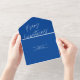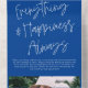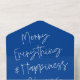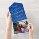 This fun holiday photo card design features a bright blue background with white modern calligraphy script greeting and one horizontal photo. The greeting says "Merry Everything & Happiness Always". On the outside of the card is your return address and another personalized greeting. When the photo is torn away as a keepsake the recipient will also have your greeting on the back of the photo portion. As you can see there is need to order envelopes!!