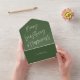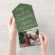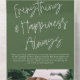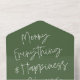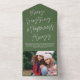 This fun holiday photo card design features a classic white and green background with a modern calligraphy script greeting and one horizontal photo. The greeting says "Merry Everything & Happiness Always". On the outside of the card is your return address and another personalized greeting. When the photo is torn away as a keepsake the recipient will also have your greeting on the back of the photo portion. As you can see there is need to order envelopes!!