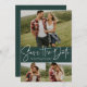 With a three photos and a modern script written "save the date" in white on a rich green background, this card is the perfect way to announce your engagement and upcoming wedding to friends and family. The white text is bold and modern but still sophisticated. The customizable text on the front has room for names, date, location and other information like a wedding website. The back is a matching hunter green with a white starry speckle. The colour can be changed by clicking "customize further."