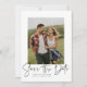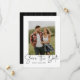 With a single vertical photo and a modern script written "save the date," this card is the perfect way to announce your engagement and upcoming wedding to friends and family. The black text is bold and modern but still sophisticated. The customizable text on the front has room for names, date, location and other information like a wedding website. The back is a black and white striped pattern. The black colour is editable by clicking "Customize."