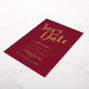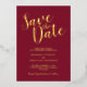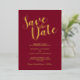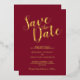 This design title "Save the Date" in real gold foil modern script font with wedding details in real gold foil modern sans serif font on burgundy red background.