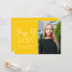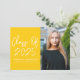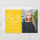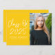 Modern graduation party invites featuring "Class of 2025" in a white handwritten script on a yellow background. Personalize the front of the graduation invite by adding the graduate's name, school name, and vertical photo. The invite reverses to display your graduation party details in white lettering on a yellow background.
