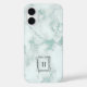 Elegant monogrammed phone case features a printed marble patterned background in pale shades of seaglass green. Add your single initial monogram in black, surrounded by a thin geometric border.