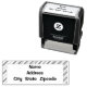 A close-up view of a self-inking stamp, showcasing its sleek black design and clear label area. The camera performs a slow zoom in, emphasizing the details of the stamp's surface and the text placeholder for 'Name, Address, City, State, Zipcode.' The background is softly blurred, creating a professional and clean atmosphere. The lighting is bright and even, enhancing the stamp's features. The scene conveys a sense of organization and efficiency, perfect for office supplies.