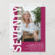 Modern 70th Birthday Invitation - Design features a pink background that can be changed to any colour, a portrait photograph, the text 'SEVENTY' in bold white font and an elegant birthday party template that can easily be personalized. Stylish, trendy and perfect for any age!