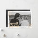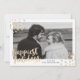 Stylish holiday photo card featuring the words "Happiest Holidays" in a faux gold foil script font, painted dots, placeholders for custom photo and text, and a black watercolor design on the back.