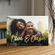 A modern save the date card designed to accommodate your favourite horizontal or landscape oriented full-bleed engagement photo. Your names appear near the bottom of your photo in gold foil handwritten script lettering, with your wedding date and wedding location beneath. Personalize the back with additional details, such as your wedding website.