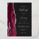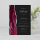 The left-hand edge of this elegant modern wedding invitation features a burgundy red watercolor agate border trimmed with faux silver glitter. The customizable text combines handwriting, copperplate and italic fonts in real silver foil on an off-black background. The reverse side features a matching burgundy and silver agate design.