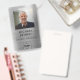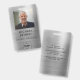 Custom Modern Silver Employee Photo Badge. Personalize this corporate id card badge with your employees name, position, photo and your company logo on the front side and your custom info text on the back side. The employee photo works best in square format. Your logo works best as a png square format with transparent background. The placeholder logo you see on the badge will be completely replaced with your own logo design.