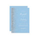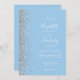 The left-hand edge of this elegant modern wedding invitation features a silver faux glitter design. The customizable text combines white handwriting, copperplate and italic fonts on a baby blue background. The reverse side provides space for wedding details on a solid baby blue background, along with a QR code guests can scan to visit your website and RSVP, which saves the cost of printing and mailing separate RSVP cards.