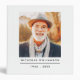Design in simple sans serif typography. Add year of birth and death and a custom photo.