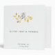 A simple but sophisticated, elegant and traditional yet chic and modern wedding gift with modern gold script. A single white rose and two small branches of eucalyptus leaves, drawn in graphite pencil, make a subtle and original decoration that lends an elegant but soft touch to festive events.