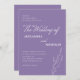 Cette faire-part de mariage élégante, simple et minimaliste présente une fleur blanche et un texte moderne avec une délicate couleur lavande à l'arrière - plan.