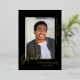 A simple, modern and elegant design for a graduation announcement with black background. The card has a space for one photo of the graduate and shows the word GRADUATE at the bottom of the photo in real gold foil. Below the photo is the name of the graduate and on the right side of the picture is the school name and class of 20XX. Black and gold make for an elegant combination.