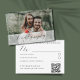 Introducing our elegant RSVP response card, designed with a personalized touch to make your wedding planning seamless. This sophisticated card features your customized photo, adding a personal and heartfelt element. The sage green accents provide a touch of natural elegance, perfectly complementing the simple yet stylish design. Included is a convenient QR code that links directly to your wedding details, making it easy for your guests to respond and access important information. This RSVP card combines practicality with beauty, ensuring your guests can effortlessly share in your special day.