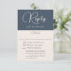 Project a sense of modern simplicity with this stylish simple wedding response card design in navy blue. It features a modern calligraphy script paired with a simple italicized type face presenting your info with clean minimalist styling. The text template includes entries for including the meal selections for your wedding reception. Personalize the text template with your meal selections and the required wedding response date. Other matching wedding products are available to coordinate with this design.