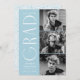 Trendy graduation party invites featuring the graduate's three photos located to the right of the design in a vertical layout. "Grad" is displayed in white, modern art deco lettering with a sky blue background. Personalize the modern photo graduation party invite by adding the graduate's name, graduation year, and school name. The design reverses to display your graduation party details with a light blue and white geometric swirl background. Perfect for both high school and college graduations!